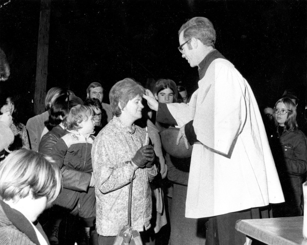 Click on the image above to hear an audio recording of a 1972 Ash Wednesday service in which Father Michael Doyle, a participant in the 1971 Camden draft board raid, made ashes from burned copies of the Pentagon Papers. To mourn the destruction and loss of life caused by warfare, Fr. Doyle burned the papers in a soldier’s helmet. In the image above, he applies ashes to the forehead of a service participant. Photo courtesy of Anthony Giacchino.