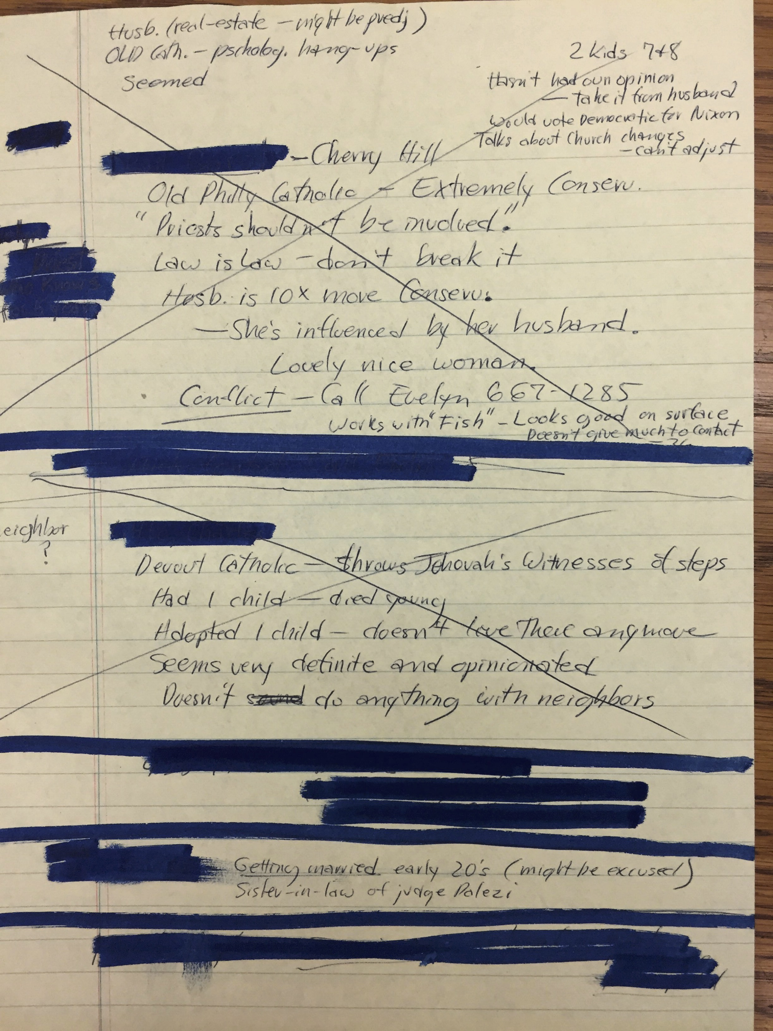 Jayma Abdoo was one of several volunteers who aided the defense team of the Camden 28 by assessing potential jurors. Pictured above are her handwritten jury research notes. Image reproduced from the Jayma Abdoo Papers, courtesy of the Swarthmore College Peace Collection.
